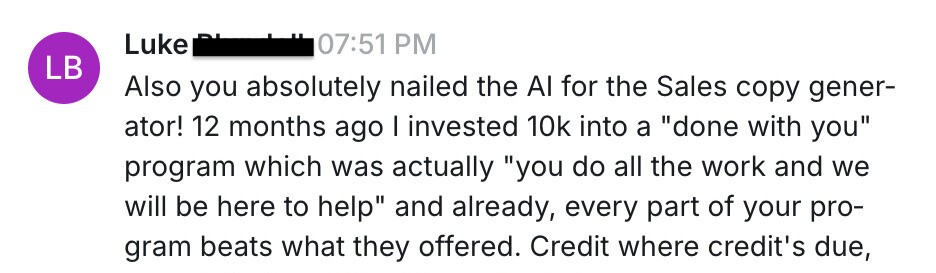 6 months of access to "Beau's Brain," an AI tool that is trained on the full course, past Q&A's, and my marketing frameworks. This tool can guide and coach you similar to how I would. Ask it anything and get the answers you need fast. This tool also works right inside our Slack community for easy access anytime.